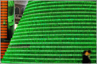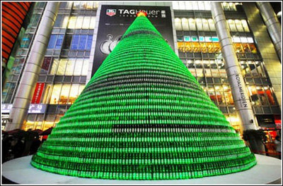 Цвет упаковки этого пива идеально подошёл для «новогоднего дерева» – «ёлка» стала абсолютно зелёной. И в прямом, и в переносном смысле – при подготовке такого украшения не пострадало ни одно настоящее деревце. Кстати, установка хмельного деревца на одной из шанхайских улиц изначально и задумывалась как акция против вырубки елей. Теперь же любители пивка «нарезают» круги вокруг елки и гадают: когда же это чудо-деревце можно будет употребить по прямому назначению. Ведь особенность этой конструкции, в том, что пивные бутылки – полные!