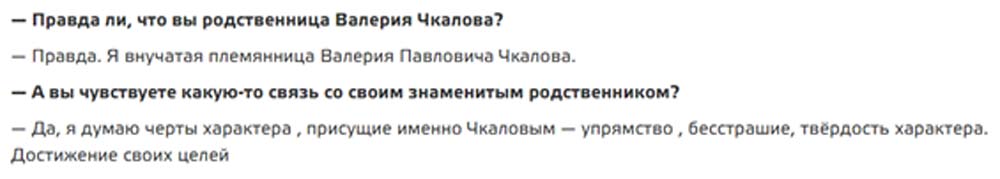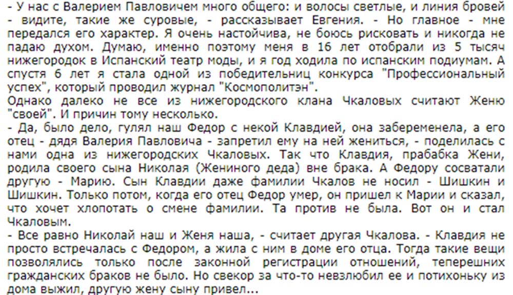 И вроде бы реакция потомков Чкалова в духе «вы кто такая, мы вас не знаем» могла смутить Евгению, однако в своих многочисленных интервью женщина подчеркивает свое родство с летчиком: