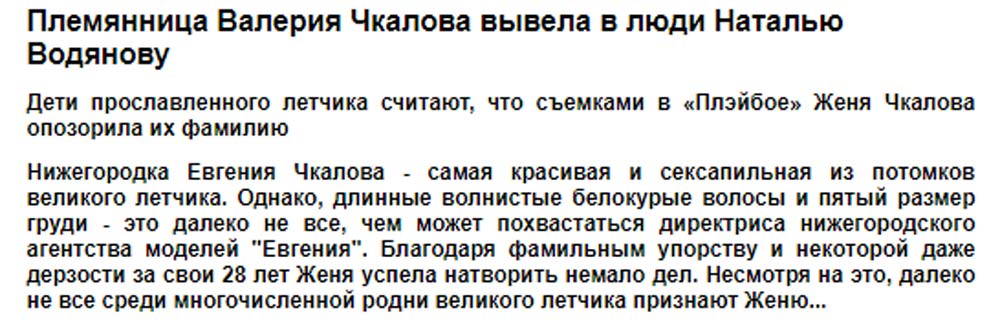 Годом позже выходит публикация, в которой нижегородская модель рассказывает о съемках в журнале «Плейбой» в 1999 году. Возможно именно этот факт настроил московских родственников Чкалова против Евгении и ее сестры. Для первых позор, для вторых – слава.