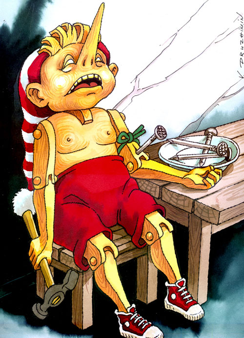 П: Лис и Кот - разбойники с садистскими наклонностями. Раздирали рот Пиноккио ножом. Вздернув его за шею, ждали, когда тот «перестанет трепыхаться» и станет «хорошеньким, мертвеньким» с «очень-очень хорошо раскрытым ротиком». Кстати, Пиноккио откусил Коту лапу.
