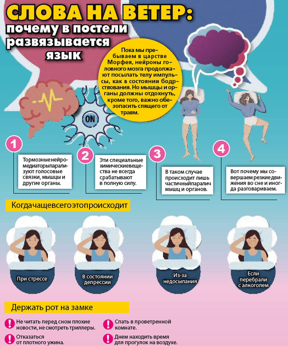 - Если разговоры случаются в быструю фазу сна, человек активно двигает глазными яблоками, может привставать, иногда даже четко отвечает на вопросы, - объясняет эксперт. - Но чаще эпизоды сомнилоквии случаются во время неглубокого медленного сна. С помощью проговаривания и бормотания спящий облегчает переход в другую стадию, как бы убаюкивая себя. Обычно это явление безобидно - если не мешает тем, кто рядом. Но может напугать: например, ребенок указывает в угол, уверяя, что там кто-то стоит. Он делает это несознательно, но все равно жутко.