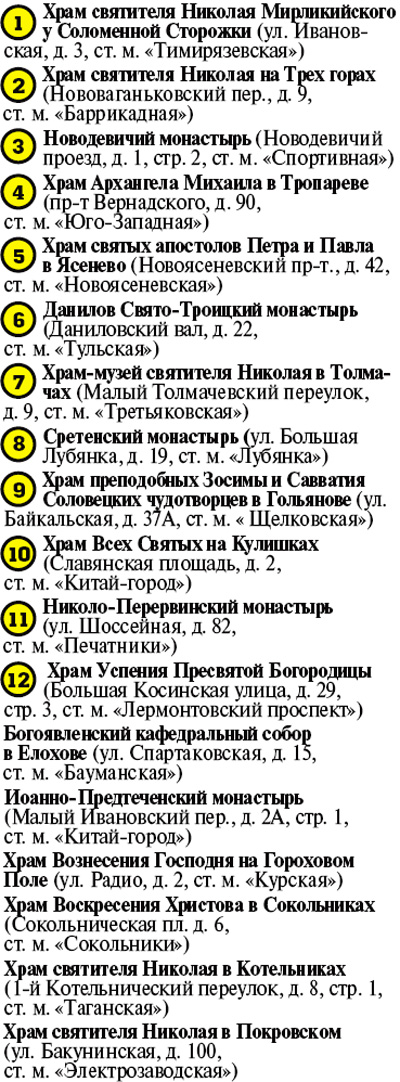 Если вы не сможете попасть в храм Христа Спасителя или Александро-Невскую лавру (в Санкт-Петербург ковчег с реликвией доставят 12 июля, где он пробудет до 25 июля), не расстраивайтесь. Мощи Николая Чудотворца постоянно хранятся во многих московских церквях (см. схему), куда можно попасть без всякой очереди.