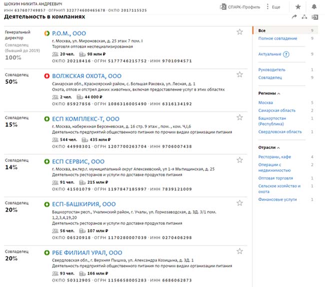 Согласно данным «СПАРК-Интерфакс», Никита Шокин владеет филиалами компании отца, а также выступает соучредителем и руководителем группы компаний «ЕСП», которые фактическими исполнителями контрактов RBE Group с РЖД.