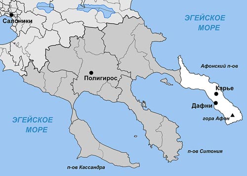 Пораженная красотой местности, Дева Мария попросила у Бога это место себе во владение. На что получила Божественное согласие: «Да будет место сие удел твой, и сад твой, и рай, и пристань спасения желающих спастись». Ныне эта административная единица Греции официально именуется «Автономным монашеским государством Святой Горы» и объединяет 20 мужских монастырей и 12 скитов.