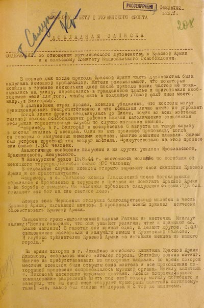 В докладной от 24 августа говорится об отношении католических священников к частям РККА и к Комитету Национального Освобождения Польши. В записке отмечается, что настороженность духовенства сменилась симпатией к Красной Армии. Священники призывали местных жителей помогать красноармейцам в борьбе с фашистами.
