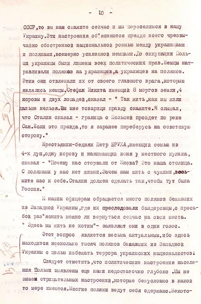 Кроме того, в разделе «Настроения населения Польши» есть фрагмент, посвящённый украинцам, которые хотят, чтобы территории Западной Украины перешли к СССР, как «исконно русские». Обращались к советским офицерам и поляки, бежавшие с Западной Украины, где бандеровцы их преследовали.
