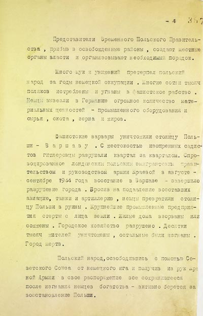 Советские войска начали освобождение территории Польши летом 1944 года. К этому периоду относится архивное Политдонесение от 6 августа 1944 года, в нём сообщается, что местное население радостно встречало Красную Армию. В документе есть описание: жители угощают освободителей небогатыми запасами и рассказывают, что гитлеровцы издевались над ними, грабили и убивали. Еврейское население страны уничтожено почти полностью.