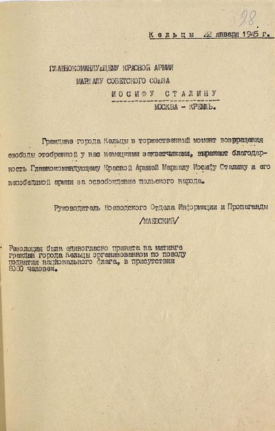 Листая архивные документы, сравнивая сухие факты с их более поздним «творческим осмыслением», легко заметить, что именно с памятью у жителей Польши серьёзные проблемы. Десятки, и это только опубликованных, свидетельств о дружелюбии и радости, обещания ухаживать за могилами освободителей и передать это уважение потомкам - всё это практически забыто. Остались только пожелтевшие листки, такие, как отправленная 22 января 1945 года благодарственная телеграмма Главнокомандующему Красной Армии Сталину от жителей польского города Кельцы.