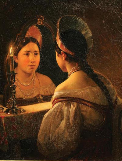 С этим поверьем связано одно из самых популярных гаданий, которое считалось очень точным, но при этом и самым опасным. Девушка на выданье ставила на стол зеркало, а по бокам от него две зажжённых свечи. Сама она должна была сесть перед ним так, чтобы не видеть своего отражения. А в зеркале ей должен был явиться суженый. Но если тот ее поманит, то надо успеть трижды перекреститься и крикнуть: «Чур меня!». Иначе гадающую ждала скорая смерть.