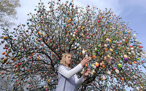 Пасхальное дерево Фолькера Крафта из г.Заальфельда известно по всей Германии. Его Osterbaum, традиционное для этой страны, украшает около десяти тысяч разноцветных яиц. Скорлупу пенсионер с женой собирают год. Семейной паре в благом начинании помогают подросшие дети и внуки.