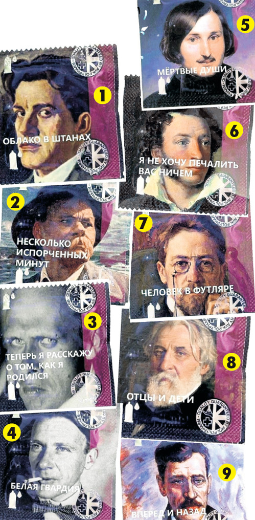 Пропагандировать безопасный секс через цитаты наших великих классиков пришла в голову копирайтеру из Екатеринбурга Илье ЗОРИНУ. Он подобрал названия произведений или выдержки из них, которые подходят к случаю, и поместил их на упаковки с презервативами. А что, неплохая идея! Глядишь, нынешняя мало читающая молодежь заинтересуется, что это за дядьки нарисованы и к чему тут изречения. И после плотских удовольствий перейдет к духовным.