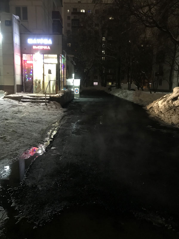Мини-трактор раскидал по углам сугробы. Снег на асфальте остался - куда его денешь, если сверху сыплет. В общем, на него и плюхнули дымящуюся черную массу. Раскидали, разровняли - на все ушло минут 15. На поверхности тут же появились лужи. А из недр выступила щебенка - пожелала сразу выйти из игры, пошутили в домовом чате. Через пару часов черное полотно засыпало снегом. Проверить, что там наделали, невозможно. Старые-новые бордюры замуровали одинаково. А значит, по весне асфальт снова будут ломать. И так по кругу.
