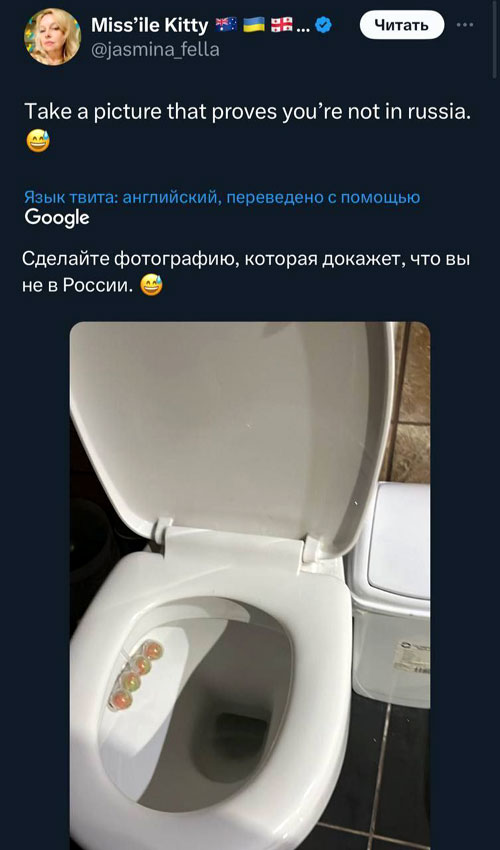 Тем временем в западных соцсетях новый тренд: европейцев попросили сделать фото, «которое докажет, что вы не в России». И знаете, что эти придурки чаще всего снимают? Сантехнику! Большинство из них действительно думает, будто у русских дома нет унитазов и душевых кабинок.