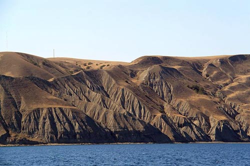 Если доехать до Судака и свернуть влево, то через некоторое время вы увидите совершенно мистический пейзаж: пустынный песчаный обрывистый берег, по которому гуляет ветер. Это — мыс Меганом, за первым хребтом которого вы оказываетесь будто отрезанными от цивилизации, в каких-то древних временах.