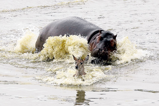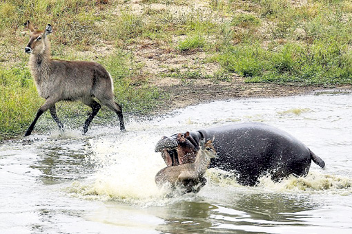 По заповеднику Нгала (ЮАР) пронесся крик хо-хо. Сомнений у зверья не осталось: на вечернюю охоту вышли гиеновые собаки. Вскоре от дюжины хищников со всех ног пришлось улепетывать двум самкам водяного козла с детенышем. Дикие собаки способны долго поддерживать скорость до 50 км/ч и такую добычу догоняют максимум за 15 минут. В отчаянии «ужин» бросился в ближайшую реку. Антилоп больше пугали собаки, чем крокодилы. Две рептилии сразу поплыли к легкой добыче. Но в воде нашелся зверь и пострашнее - в схватку вступил разъяренный самец-бегемот, полновластный властитель здешних мест. Его безразмерная пасть и огромные клыки способны запросто перекусить что крокодила, что антилопу. «Зубастики» сразу нырнули от греха подальше, и антилопы остались один на один с 4-тонным гиппопотамом. Шансов на спасение не было - безжалостные челюсти разорвали детеныша антилопы. После чего взрослые водяные козлы выбрались на берег и начали отбиваться от собак. Вечный круговорот жизни и смерти продолжился…