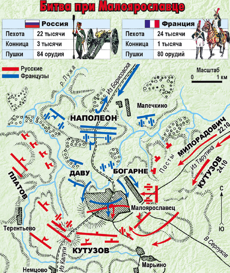 В ночь на 24 октября в Малоярославец вошли части под командованием вице-короля Италии, пасынка Наполеона Евгения Богарне. Но утром подоспели гренадеры генерала Дмитрия Дохтурова и выбили французов. Те, дождавшись подкрепления, пошли в атаку и вновь оставили город за собой. На помощь к Дохтурову поспешил корпус легендарного генерала Николая Раевского…