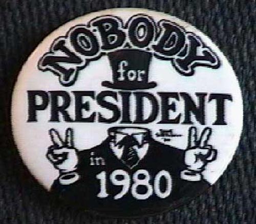В 1975 году комики Уэви Грэви и Кертис Спренглер подхватили и развили идею. Первый назначил себя главным менеджером предвыборной компании, а второй – «Дураком Никого». С тех пор они колесят по стране с митингами-шоу. И хотя мистер Никто настойчиво о своих политических амбициях не заявляет, у него есть свой сайт, где отмечается, что он будет готовиться к президентским выборам 2020 года.