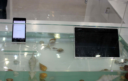 На стенде Sony тоже стоял аквариум, в котором плавал новый флагманский телефон Xperia Z2 и ультратонкий планшет Xperia Tablet Z2.