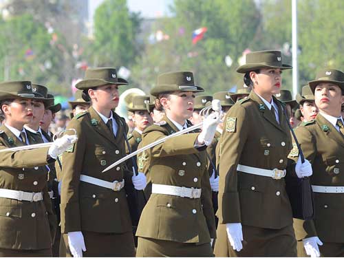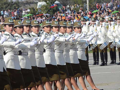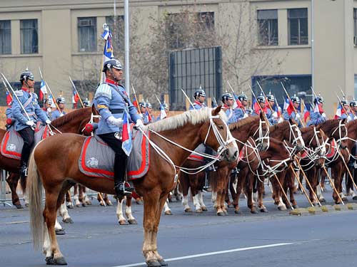 В столичном парке О'Хиггинс на глазах у изумленной публики, вооруженной смартфонами и другими гаджетами XXI века, чеканят шаг под «Марш Радецкого» Штрауса-отца ряды военнослужащих. В шествии участвуют и карабинеры, выполняющие в Чили функции полицейских и жандармов, и уланы, гарцующие на скакунах. Тут и цветные шелковые пояса с кистями, и блестящие шлемы с плюмажем. Замечательный элемент в одежде чилийских военных на параде - пикельхельм (пикельхаубе)— шлем, украшенный пикой, на которую водружен плюмаж, этакий «конский хвост», развевающейся во время марша.