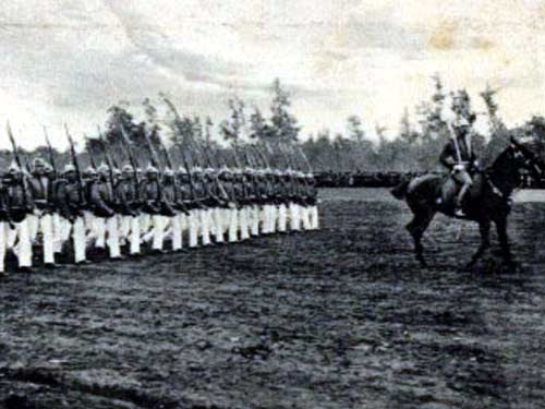 Но что особенно восхищает гражданских, так это перенятый у немцев так называемый печатный шаг: бравые чилийские солдаты в касках немецкого образца энергично поднимают прямую ногу, иногда до уровня пояса, наступая затем на всю стопу. Даже у самих немцев подобный шаг был более скромный и «эргономичный».