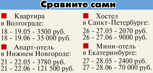 Если болельщики пожелают задержаться на неделю, выложить им придется до полумиллиона рублей. Это никак не вяжется с распоряжением правительства не задирать цены сверх нормы - в каждом регионе установлен свой «потолок». Самый шикарный номер, скажем, в Калининграде не может стоить дороже 28,5 тысячи рублей за ночь. На деле во время проведения матча Хорватия - Нигерия, который пройдет 16 июня, в гостиницах запрашивают до 130 тысяч рублей. В Екатеринбурге за двухместный номер, который в мае можно забронировать за 2,2 тысячи рублей за ночь, 16 июня придется отдать больше 60 тысяч - в этот день схлестнутся Египет с Уругваем.