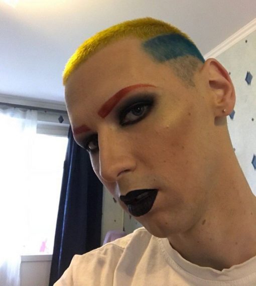 Молодой человек, подобно своему кумиру, теперь красит губы и глаза в черный цвет. Кроме того, Терешин покрасил голову в кислотные цвета - желтый, розовый, голубой. А на последней фотографии качок еще и сбрил брови, нарисовав новые розовым цветом.