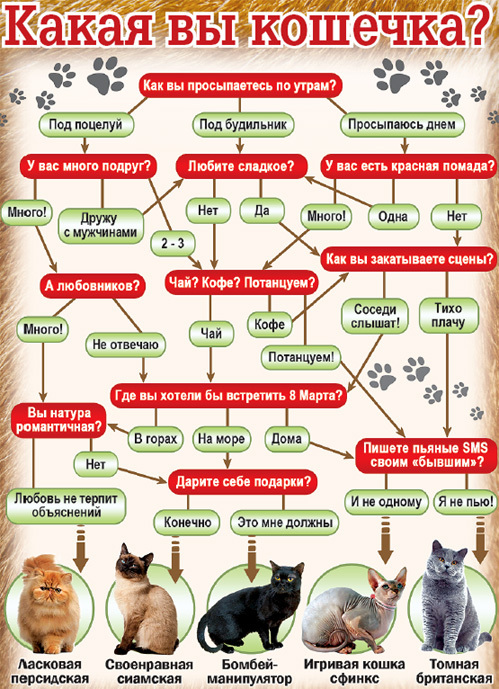 Женщин часто ассоциируют с кошками, и это сравнение звучит как комплимент: независимая, умная, гордая, а еще нежная, мягкая, белая и пушистая. В преддверии дамского праздника предлагаем нашим читательницам пройти шутливый тест и выяснить, какая порода кошек лучше всего показывает ваш характер.