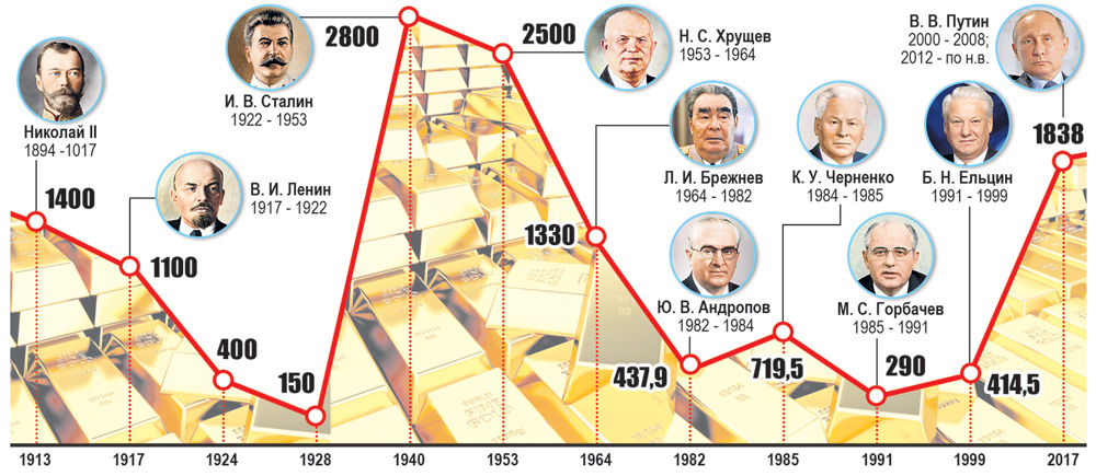 Теперь этих запасов - 1838 тонн. По объемам золотых резервов наша страна занимает шестое место в мире. Лидируют по этому показателю США - на долю золота там приходится более 70 процентов всех резервов. На втором месте - ФРГ (67 процентов). Россия от них пока отстает (18 процентов), но зато опередила Китай (2,5 процента). Эксперты считают, что запасы золота пригодятся нам в случае новых жестких санкций, если использовать казначейские облигации США будет невозможно.