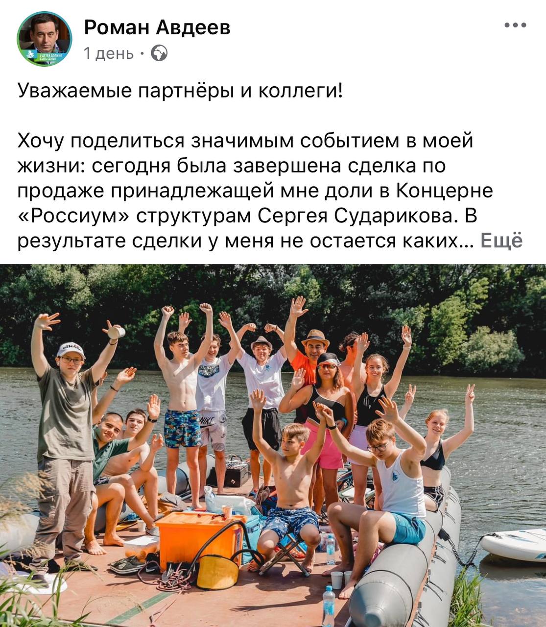 На своей личной странице в соцсети Авдеев опубликовал обращение к публике, в котором сообщил о решении окончательно выйти из всех своих российских активов. Бизнесмен отметил, что данный шаг стал финальным в объединении проектов «Россиум» и «Регион».