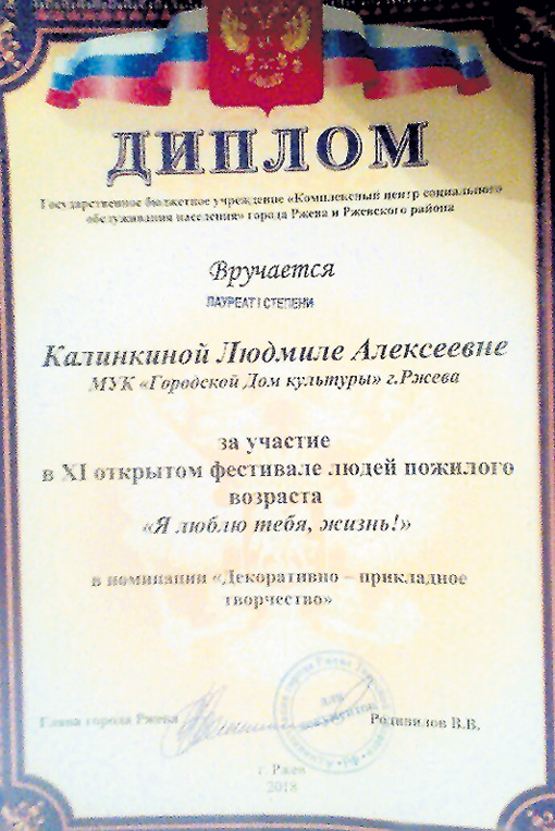 В номинации «Декоративно-прикладное творчество» лауреатом I степени стала 62-летняя Людмила Калинкина, покорившая жюри картинами и вышивкой лентами. Под аплодисменты зала глава города вручил ей диплом без рамочки и пакет с мужскими носками 42-го размера, коробкой просроченного зефира, тремя конфетками и открыткой «С Новым годом!». Власти «удачно» пристроили оставшиеся после праздников запасы.