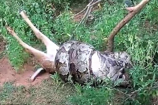 В сети появилось видео, на котором четырехметровый питон поймал оленя, а потом целиком съел. Гигантское пресмыкающееся обернулось вокруг уже мертвого животного и неторопливо заглотило его. На трапезу у питона ушло около часа.
