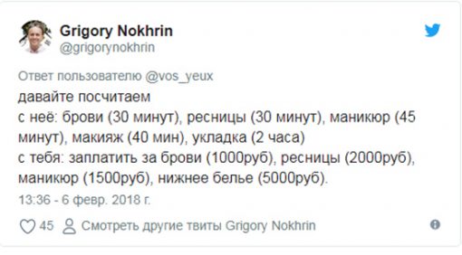 И с этого момента началась «битва полов». В ответ на твитт Настасьи Филипповны о том, что перед свиданием девушке приходится заплатить за брови 1000руб, за ресницы 2000руб, за маникюр 1500руб, за нижнее белье 5000руб, на макияж 40 мин, на укладку 2 часа, при том, что парень на свидании может просто купить «кофе за 200 рублей», мужчины стали с энтузиазмом предлагать свои версии развития события.