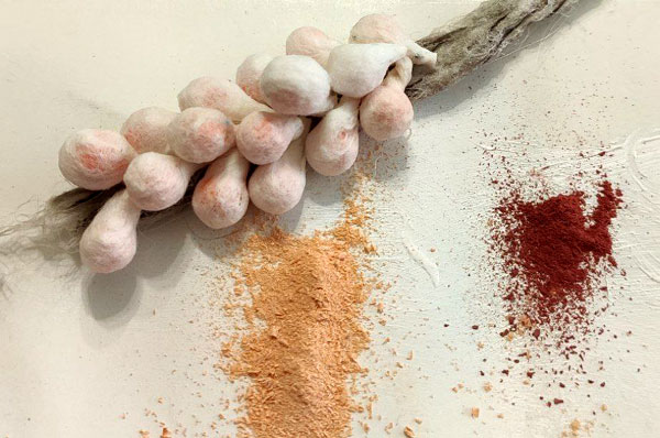 Из ваты и пенопластовых шариков делаем луковую связку - наклеиваем головастиков на нитку. Отправляем на сушку. Тонируем персиковой и бордовой пастелью. Коричневой краской рисуем корни.