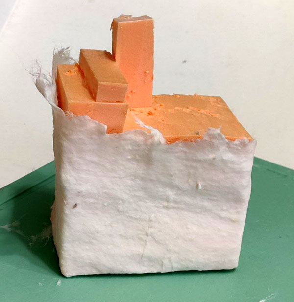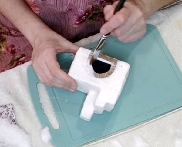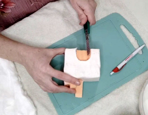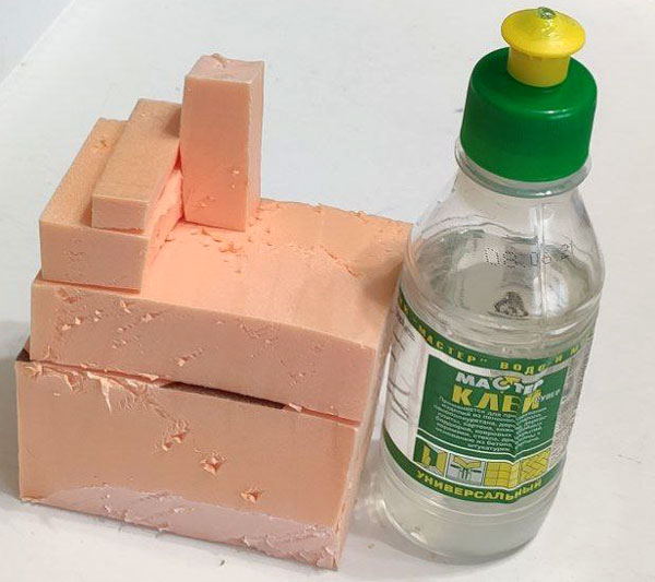 Делаем заготовку из пеноплекса 11 на 8 см (можно и другой размер). Клей на треть разбавляем водой, соединяем два выступа и трубу.