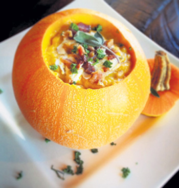 * Вливаем смесь в запеченную тыкву. Подаем на стол с хлебными сухариками и свежими овощами.