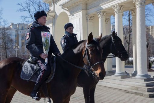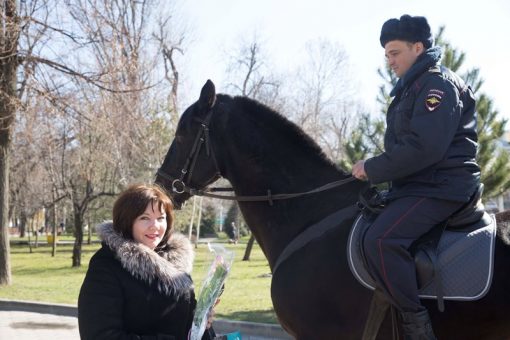 Кубанский кавалерийский взвод полиции вручил цветы случайно проходящим женщинам