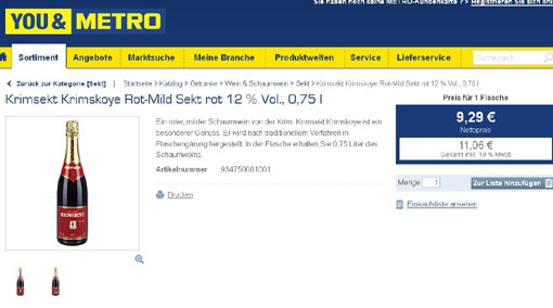 В немецкие магазины завезли крымское. К примеру, в «Metro Cash&Carry» спокойно красуется бутылочка с «аннексированной» территории. «Крымское игристое, красное, полусладкое. Изготавливается традиционным способом, имеет мягкий вкус. Истинное наслаждение» - гласит описание на сайте магазина. Стоит, правда, бутылочка недёшево: 11,06 евро. По сравнению с местным игристым по семь евро.