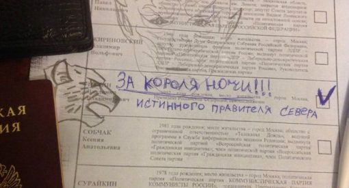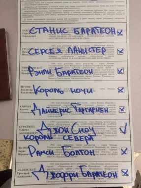 18 марта в России прошли президентские выборы, в которых победу ожидаемо одержал действующий глава государства Владимир Путин, за которого проголосовали более 76,5% избирателей. Оппозиционно настроенные россияне, которые все-таки пришли на избирательные участки, но не посчитали возможным отдать свой голос тому или иному претенденту, предпочли свой бюллетень испортить, причем зачастую делали это весьма креативно. Очень популярной в таких «художествах» была тема популярного сериала «Игра престолов».