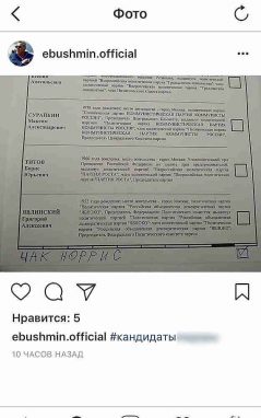 Кто-то добавлял своего кандидата, среди которых можно было встретить Чака Норриса, Сергея Шнурова, Бориса Гребенщикова**** и других звезд. Неудивительно, что сторонники Навального, который, кстати, призывал на выборы вообще не ходить, портили бюллетени, вписывая его фамилию.