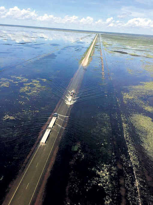 Проехать по автомобильной трассе «Грэйт Нортерн Хайуэй», проходящей по западной части материка, теперь могут только фуры. Природный катаклизм связывают с особенностями почвы: она каменистая и почти не впитывает влагу. Слой воды, покрывающей огромную территорию, - около 30 сантиметров. Есть опасность напороться на крокодилов и змей, которым наводнение только в радость.