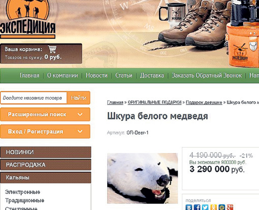 Торговать шкурами животных, внесенных в Красную книгу, строжайше запрещено. Однако в Интернете легко найти предложение по покупке шкуры белого медведя. Цена вопроса - от 3 миллионов рублей. Безымянные продавцы на сайтах уверяют, мол, покупают товар на аукционе в Канаде. В этой стране обитает две трети всей популяции зверя, поэтому охота у них не запрещена, а строго ограничена. Однако специалисты говорят, что получить все бумаги на вывоз шкуры и перевезти ее слишком дорого. И скорее всего, товар браконьерский. Кроме того, встречаются подделки: выбеленные шкуры бурого медведя.