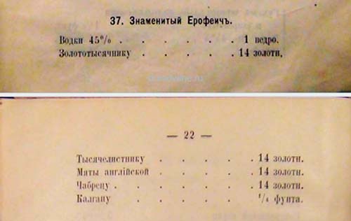 Рецептов ерофеича сохранилось множество. Есть вариант настойки и у прославленной Елены Молоховец, в книге 1901 года издания. Только нужно учитывать, что ингредиенты в нем указаны в расчете на 10 литров напитка.