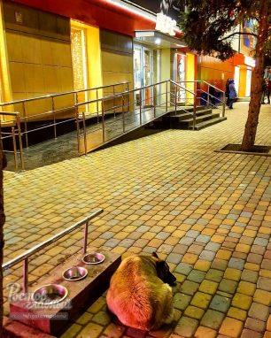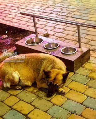 В социальных сетях жители Ростова-на-Дону обсуждают фотографии «сторожа», попавшие в городской паблик. На снимках недалеко от торгового центра бездомная собака лежит около сооружения с мисками, в двух из которых еда, а одна предназначена для воды.