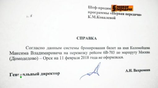 НТВ направил официальный запрос в авиакомпанию «Саратовские авиалинии», чтобы выяснить, соответствует ли рассказ Коломейцева действительности. В ответе в виде справки за подписью гендиректора значится: «Согласно данным системы бронирования билет на имя Коломейцева Максима Владимировича на перевозку рейсом 6B-703 по маршруту Москва (Домодедово) – Орск 11 февраля 2018 года не оформлялся».