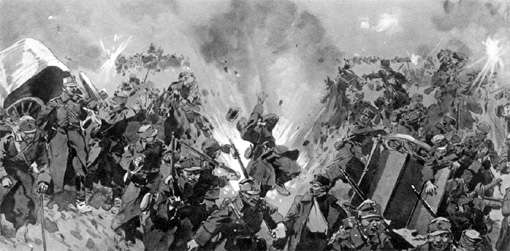 Артподготовку на различных участках вели от 6 до 45 часов. Пехотинцы шли, прикрытые плотным огнем. Двигались волнообразно: по 3–4 цепи с интервалом в 150–200 шагов. Получалось, что третья линия обороны атаковалась 3-й и 4-й волнами, накатывавшими через первые две. Такой прием в тактике впоследствии был назван "атакой перекатами".