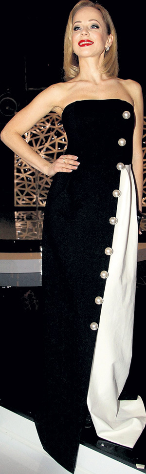 Стилист: Платье что надо! Единственное - этот костюм было бы хорошо лишить всех этих огромных жемчужин по вертикали. Макияж хорош, но помаду я выбрала бы не перламутровую глянцевую, а матовую и сухую. И прическу нужно сделать более голливудской. Я имею в виду холодную голливудскую волну.