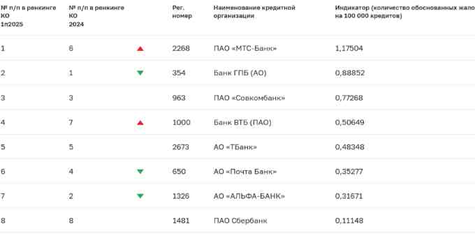 Что касается самого списка, то в него вошли банки с розничным кредитным портфелем, в отношении которых в первой половине этого года нам поступило больше одной обоснованной жалобы на кредитование — эту информацию также предоставил ЦБ. Согласно ренкингу, на первом месте по обоснованным жалобам за первое полугодие 2025 года оказался «МТС Банк». Дальше идет Газпромбанк, а с третьего по восьмое места заняли соответственно Совкомбанк, ВТБ, Т-Банк, «Почта банк», Альфа-банк и Сбербанк.