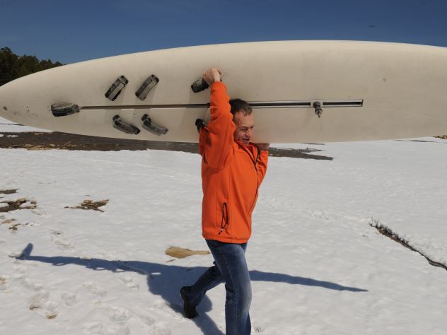 Вызволять машину из водного плена отправились двое молодых людей. Чтобы добраться до авто, они использовали доски для серфинга и весла.