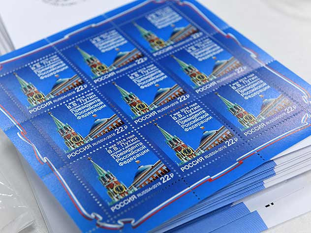 На почтовой марке, посвященной инаугурации, изображена Спасская башня Кремля, а на конверте — президентский штандарт. Эскизы разработал художник-дизайнер С. Ульяновский. Марка размером 37 на 37 мм выпущена тиражом 252 тысячи экземпляров. Номинальная стоимость — 22 рубля, сайт АО «Марка». Ранее подобные почтовые марки выпускались в 2000, 2008 и 2012 годах.