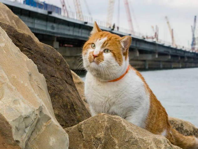 Напомним, хвостатый талисман строителей первым прошел по законченному мосту, на день обогнав президента России Владимира Путина. Во время строительства кот жил в строительном вагончике.